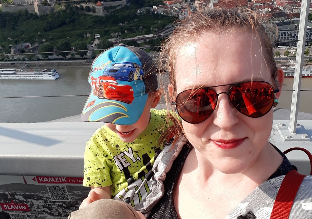 Doma sme si dali obed, malé leháro vo vreci (ako familiárne voláme náš tuli vak), potom Karol sotil sestru, ona sa rozplakala a mohli sme ísť do mesta na ďalšiu časť programu MDD. Tentoraz som miesto našla, čo zas nebolo príliš ťažké, lebo k miestu viedol dlhý rad ľudí (malá edukácia všeobecného charakteru: stojím v tom rade, pýtam si tú radu. Ďakujem). Postavili sme sa na jeho koniec súčasne s jednou štvorčlennou rodinkou. Tato, mama, dcéra a syn. Obaja o niečo starší od toho môjho. A tak si tam tak stojíme, kým neprídeme na rad. Karol si behá po tráve, nosí mi burinu k narodeninám, nachádza nových 5-minútových kamarátov, nepočúva ma, požičiava si skejtbord, pýta si skejtbord odo mňa, papá výživu, pije vodu a keď jeho sestra prestane považovať kočík za ideálnu formu úložného priestoru, rád si to tam s ňou vymení. Aj rodinka za nami si krátila čas. Rodičia si dali cigaretku, tato dvíhal deti a tie mu viseli z rúk. Alebo sa rozprávali medzi sebou. Aj o tom, pre koľko osôb je to zadarmo a ako a tak. Vravím, celý čas stáli v rade bok po boku s nami. A keď sme prišli takmer do cieľa, rozumej k pokladni vyhliadkovej veže, opýtali sa, či aj doprovod to teda má zadarmo, ako sa to písalo na stránke. Ale ako už vieme, nie všetko, čo sa píše na internete je pravda, respektíve, nie je to tak myslené, ako sa na prvý pohľad zdá (tu by som rada podotkla, že zo strany vyhliadkovej veže UFO došlo k miernemu zavádzaniu, keď nenapísali normálne, že deti do 15 rokov to majú s doprovodom zadarmo, doprovod platí 7,40 eura. Ale to by sa im do toho radu nepostavilo toľko ľudí, však áno. A keď už si vystáli rad, hádam to deťom nespravia, že ich hore nevezmú. Uznávam, dobrá kalkulácia. Ale podaktorí aj urobia).